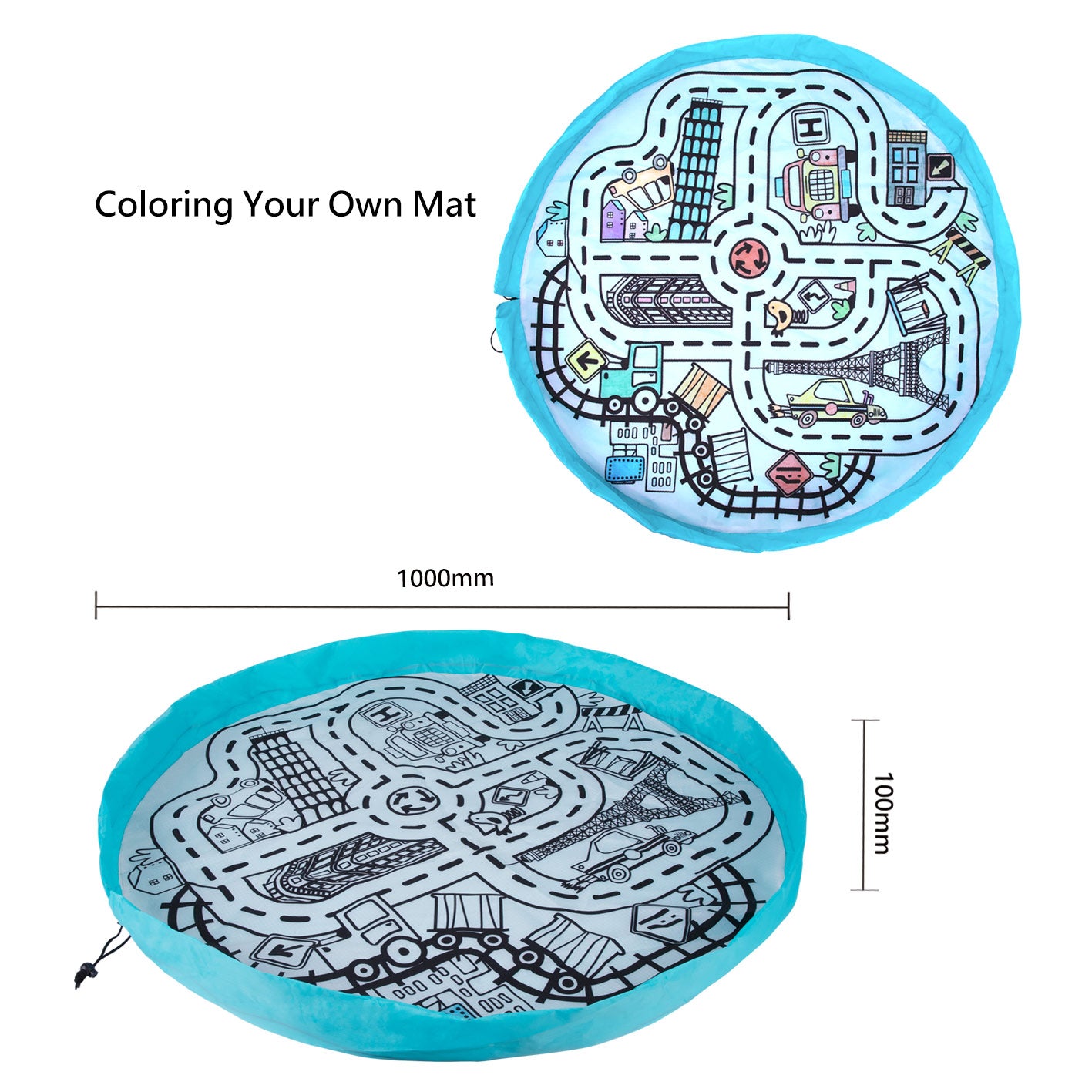 Guarda, juega y dibuja. La alfombra de juego 3 en 1 perfecta para una diversión ordenada y fácil durante el tiempo de juego. Esta gran alfombra mide aproximadamente 90 cm de diámetro y es ideal para jugar sobre la marcha. Simplemente llena la alfombra con tus juguetes y accesorios favoritos, tira del cordón y luego lleva tus cosas a donde quieras. Además, esta alfombra de juego tiene una base con temática de ciudad, que puede ser coloreada con marcadores (no incluidos).