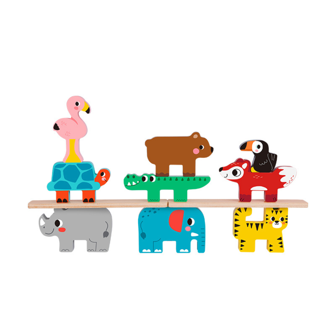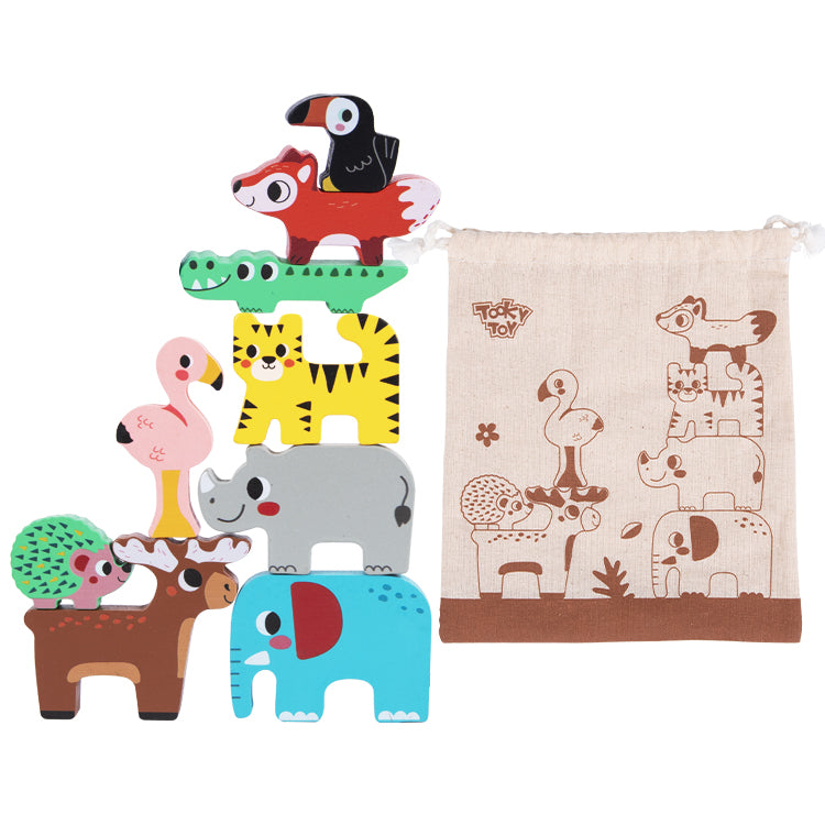 ¿Puede un elefante pararse en un zorro? ¿Caerá un erizo de un cocodrilo? Toma un animal y mira si pueden apilarse. Estos bloques de animales de madera son una forma divertida de explorar la idea de apilar y equilibrar. Este juego incluye 9 animales apilables que se pueden guardar en una bolsa de tela cuando no se usan. Cada animal de madera está pintado con pintura no tóxica.