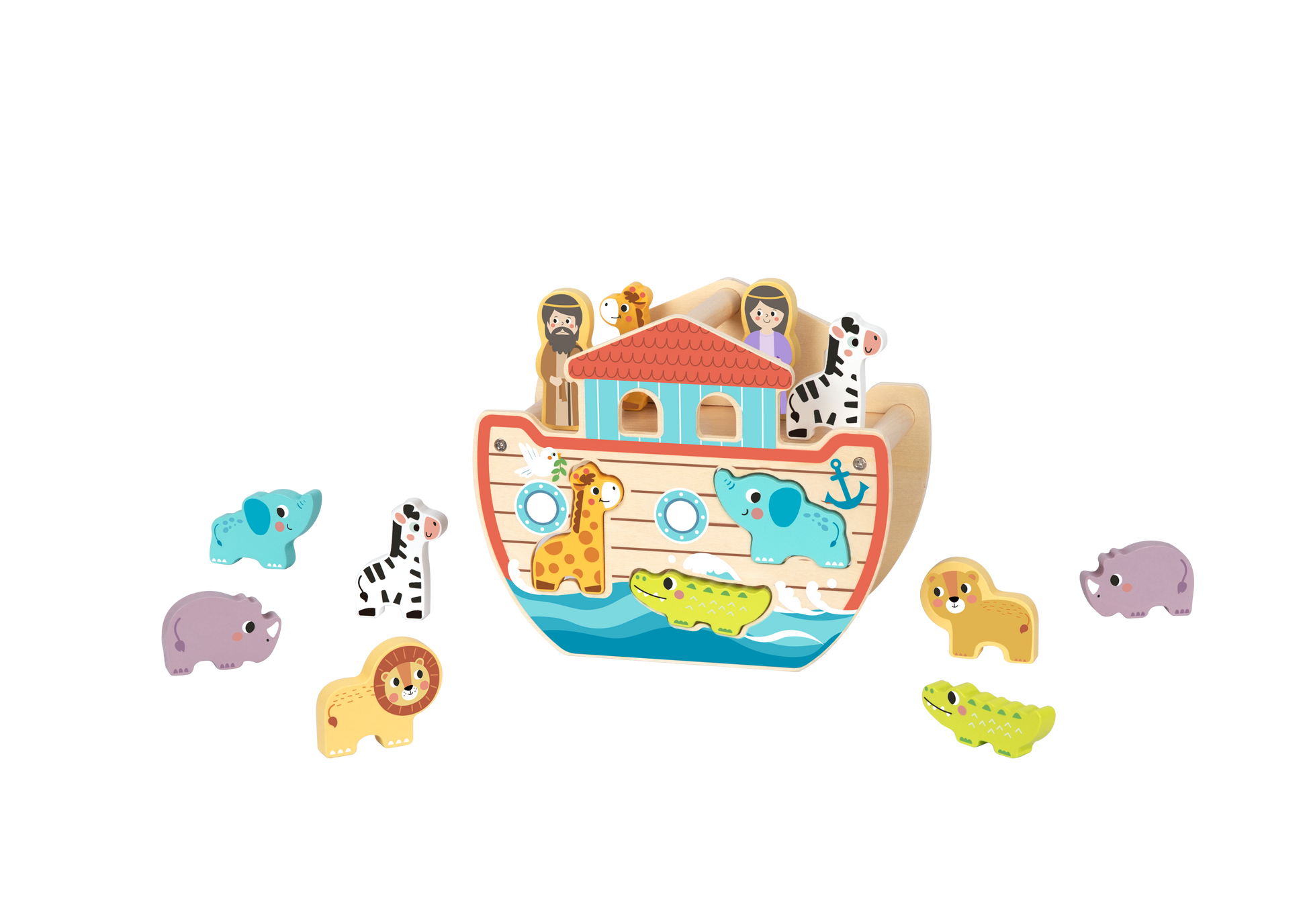 Este encantador Juego de Madera del Arca de Noé está diseñado para inspirar el juego imaginativo mientras promueve el desarrollo de la motricidad fina. El set incluye un arca colorida con olas del océano pintadas, ventanas, un ancla y un brillante techo rojo. La estructura abierta presenta varios recortes que permiten a los niños colocar pares de figuras de animales gruesas y fáciles de sostener, como jirafas, cebras, cocodrilos, leones e hipopótamos, en sus lugares designados.