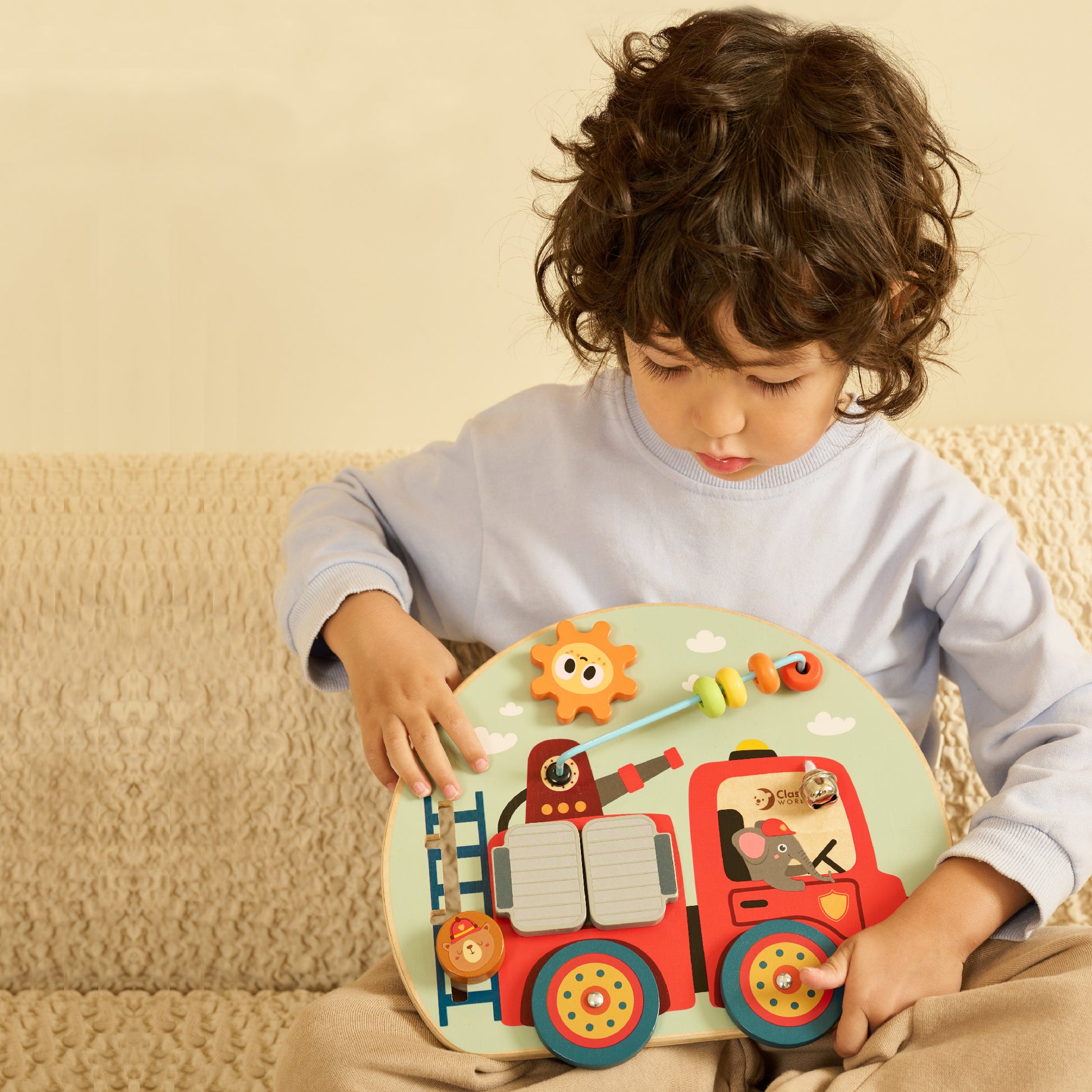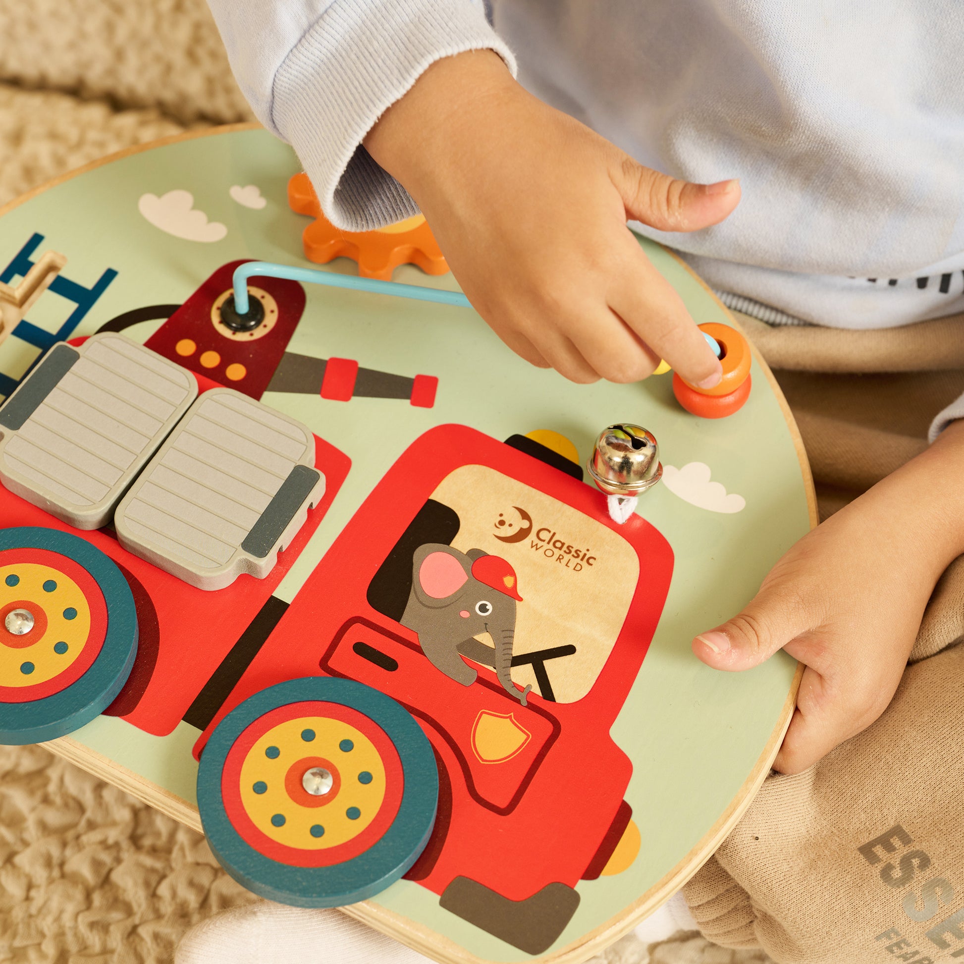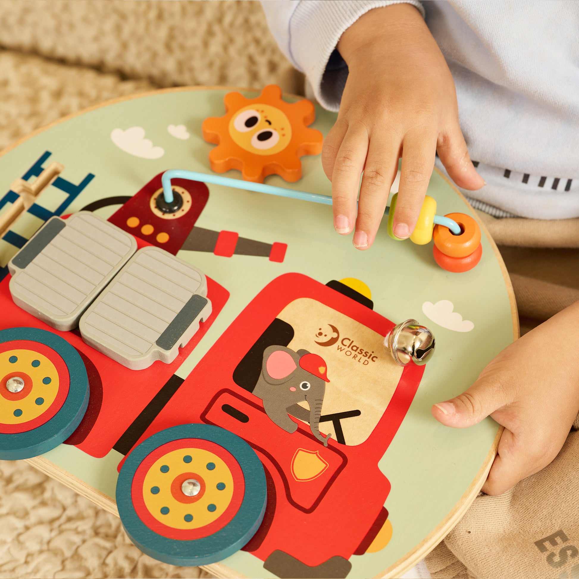 Este tablero de actividades con temática de camión de bomberos combina funciones como engranajes, juego de cuentas, laberinto, puertas, campana y ruedas. Cuenta con un extintor de incendios y una manguera como sorpresa oculta detrás de las puertas.