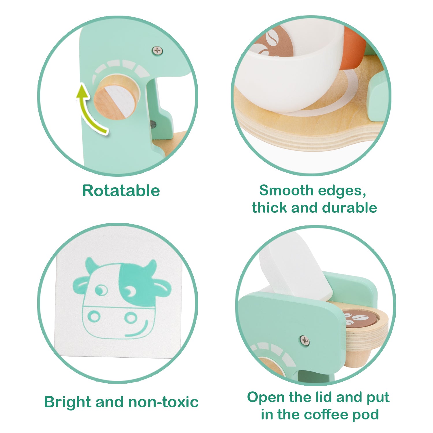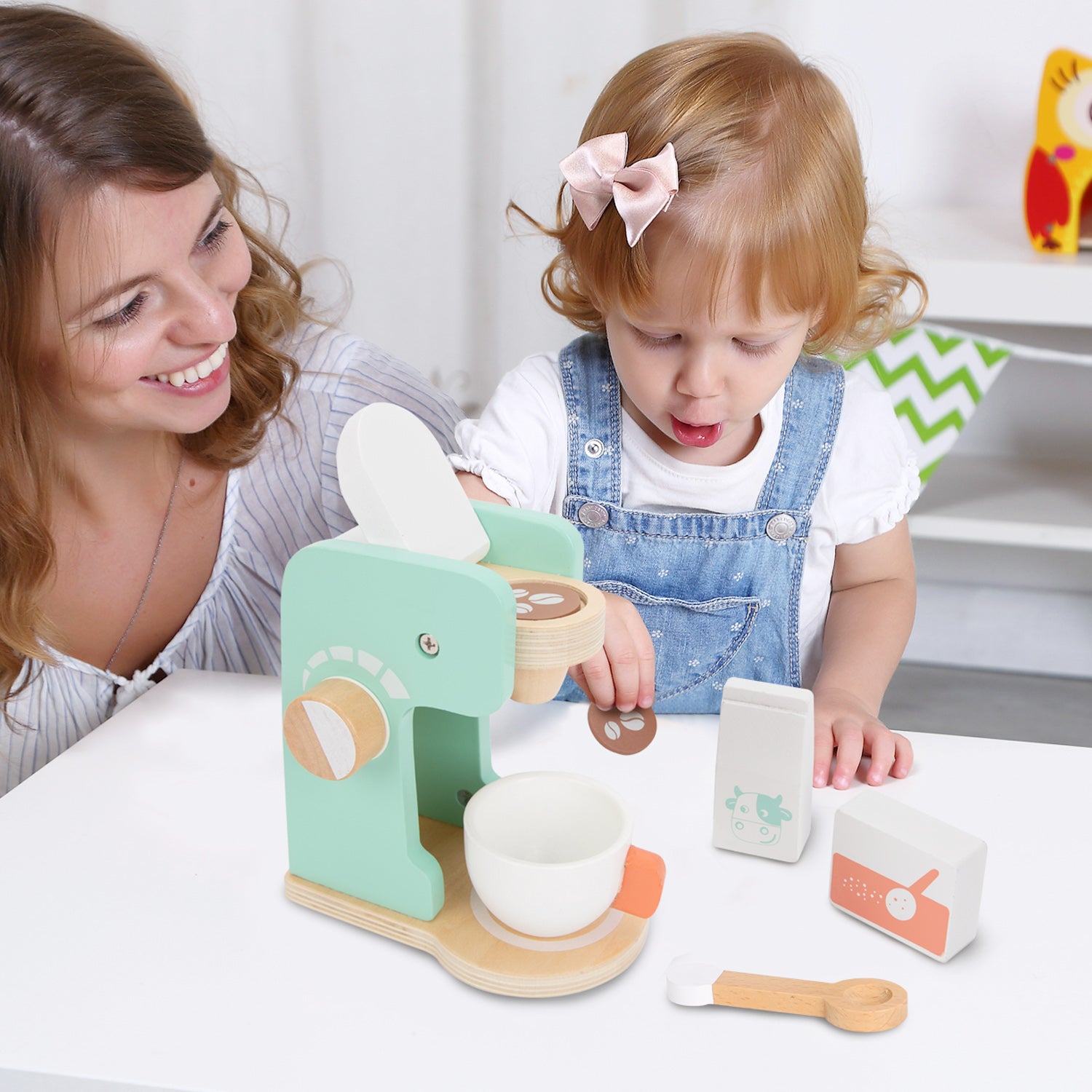 El conjunto de café de 7 piezas incluye una cafetera de colores pastel con dial ajustable y tapa levadiza para una 'cápsula de café', una taza, una cuchara, azúcar, leche y café.