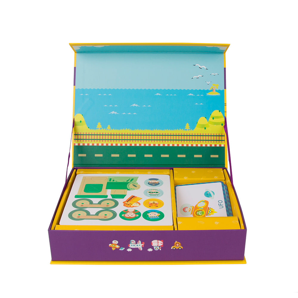 Es una caja de figuras magnéticas para aprender sobre diferentes tipos de tráfico y transporte.