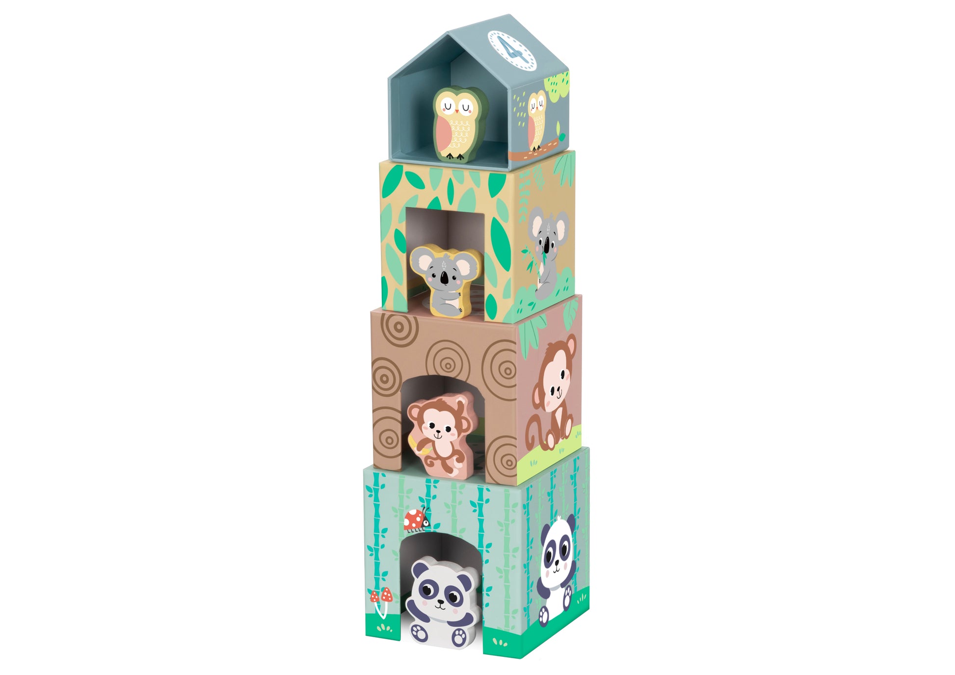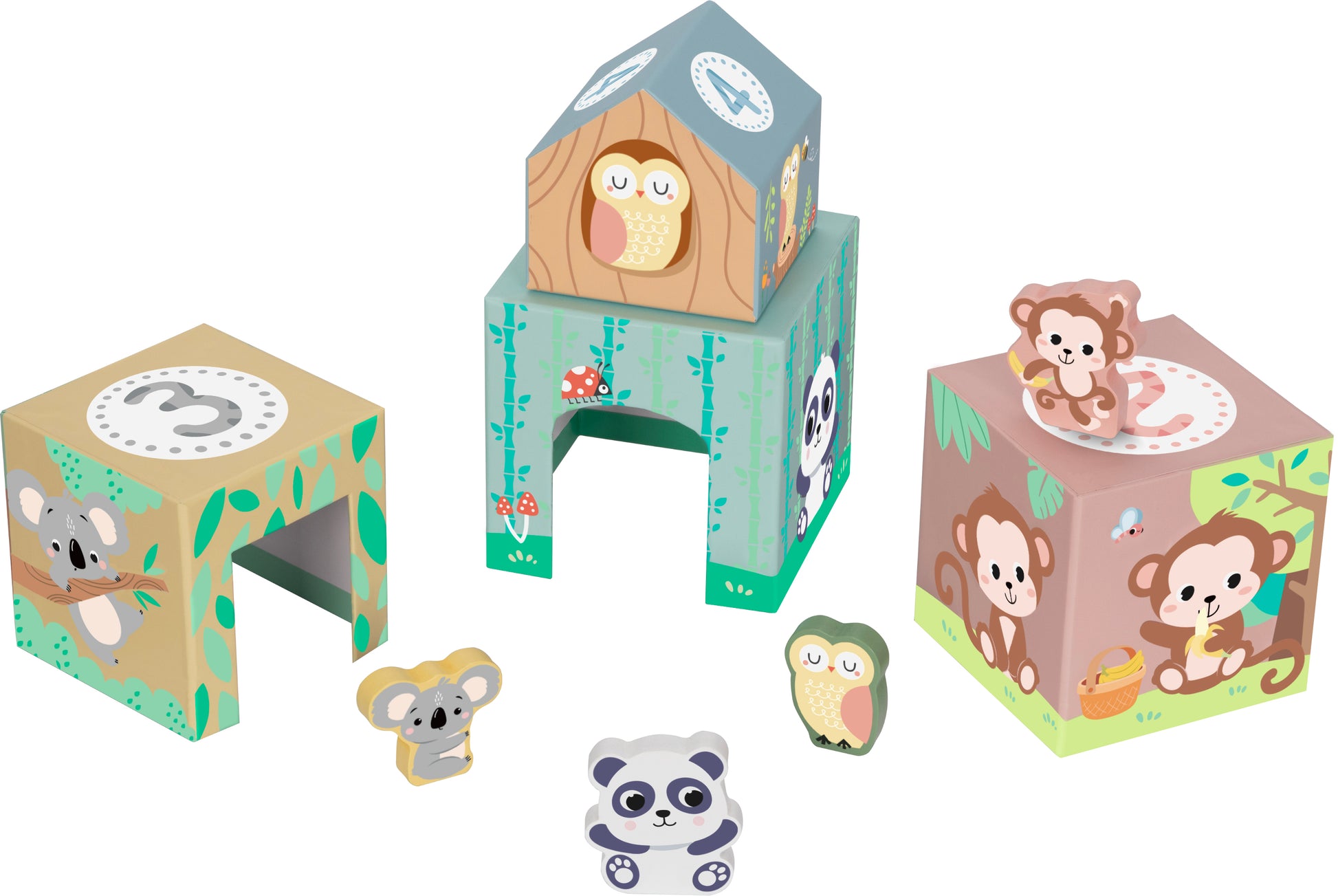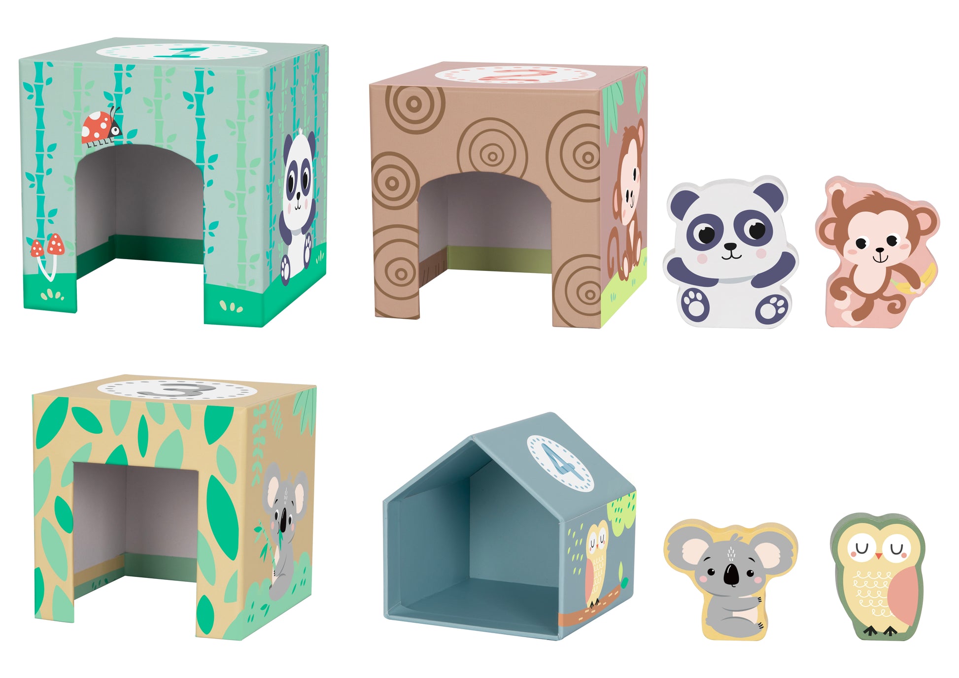 Los niños se divertirán apilando las cajas y colocando cada animal en su casita. Jugar con estas cajas es una excelente manera para que los niños aprendan sobre formas, tamaños, pares de imágenes y números.