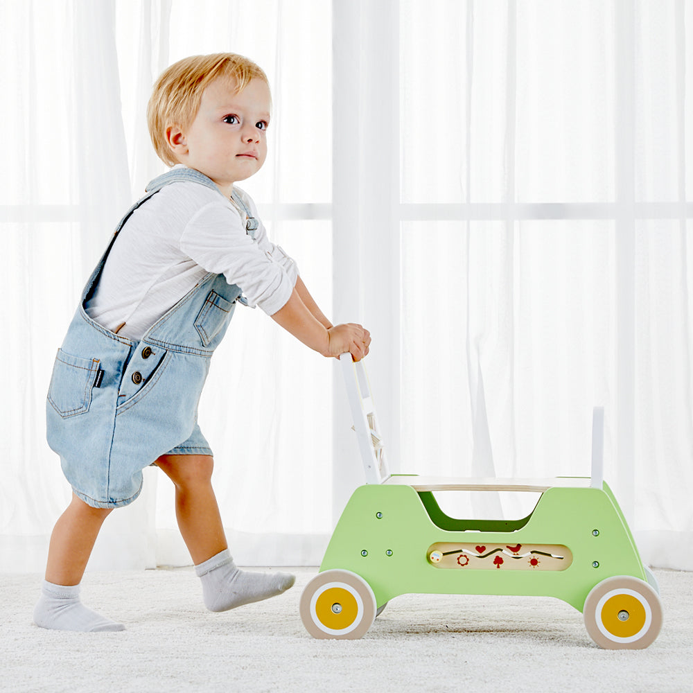 Es para niños que acaban de aprender a caminar. Pueden usarlo para moverse por la casa. Pueden montarlo, empujarlo y jugar con las funciones como el rompecabezas, las ruedas giratorias y el clasificador de formas. Es ideal para su diversión y coordinación corporal.