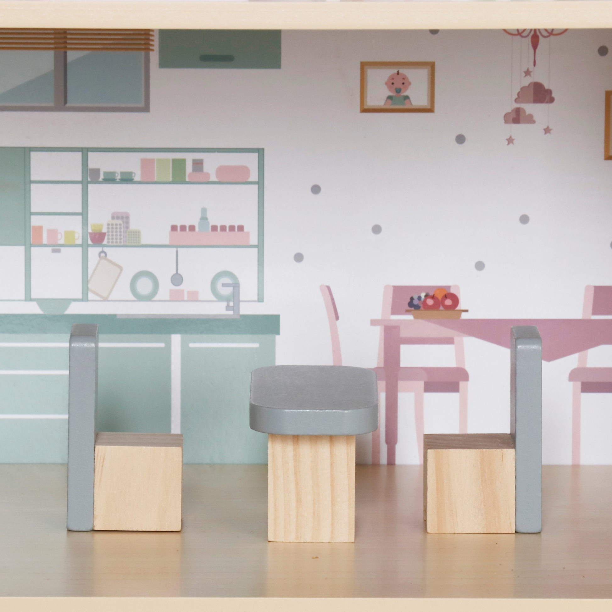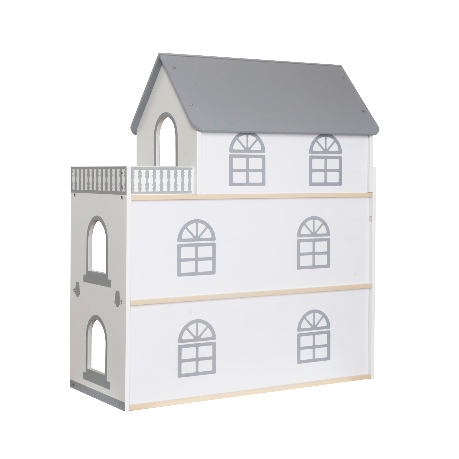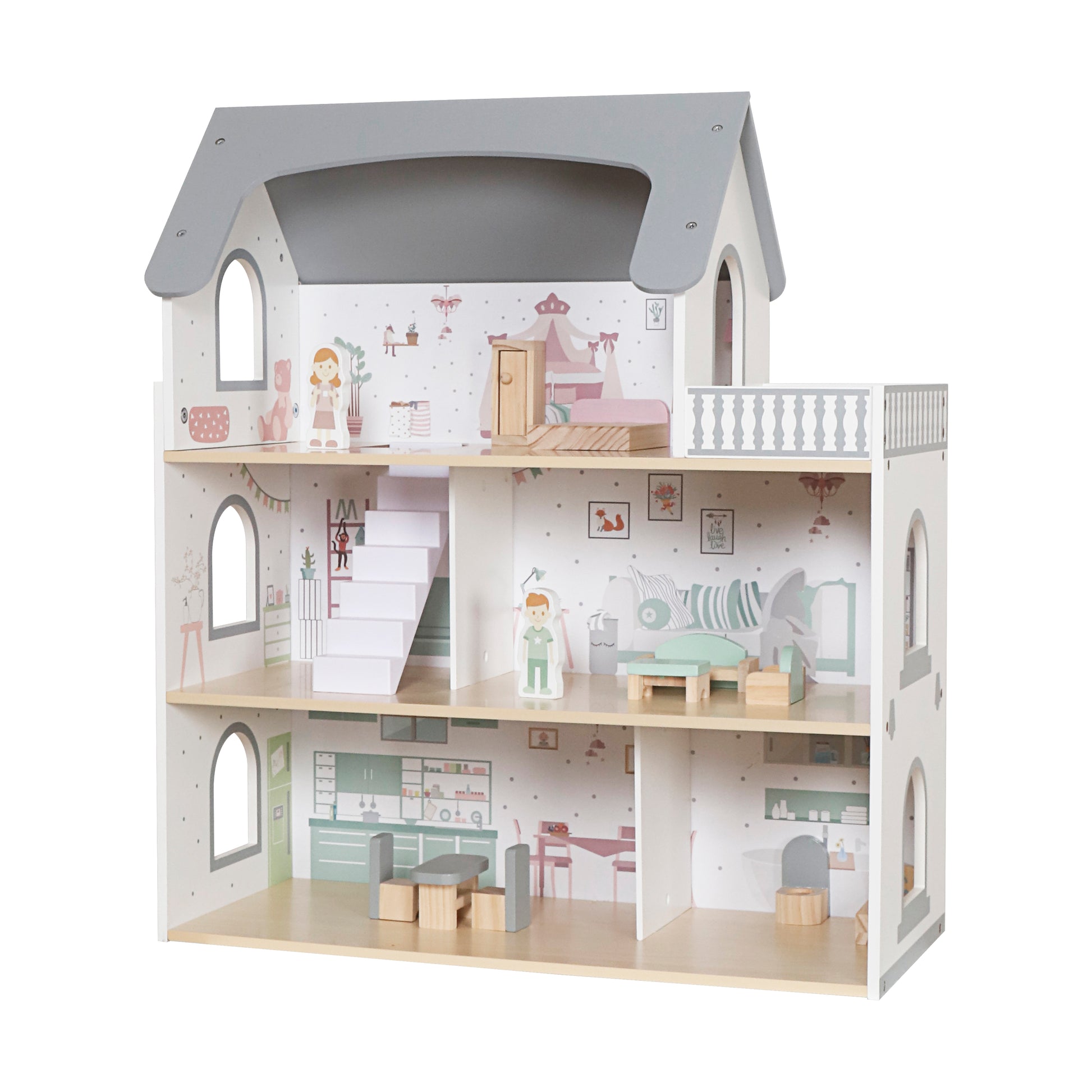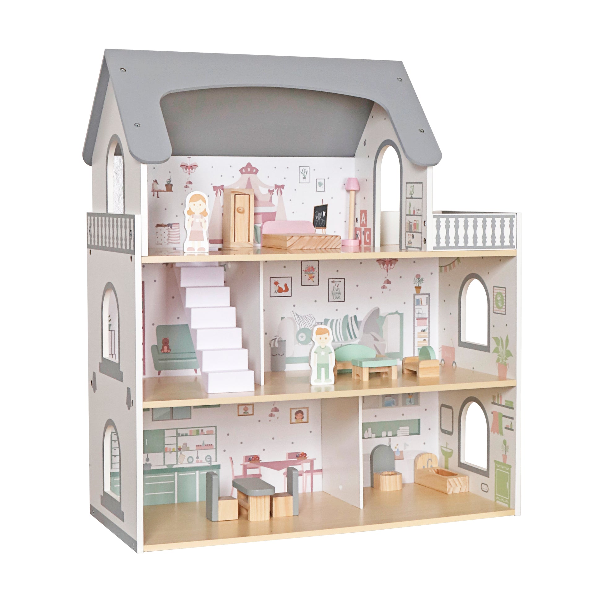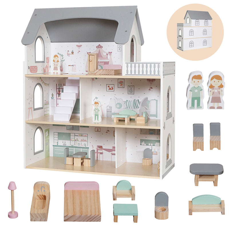 Esta encantadora casa de muñecas de tres pisos con terraza es el escenario ideal para que los niños inventen historias, decoren espacios y vivan aventuras inolvidables.