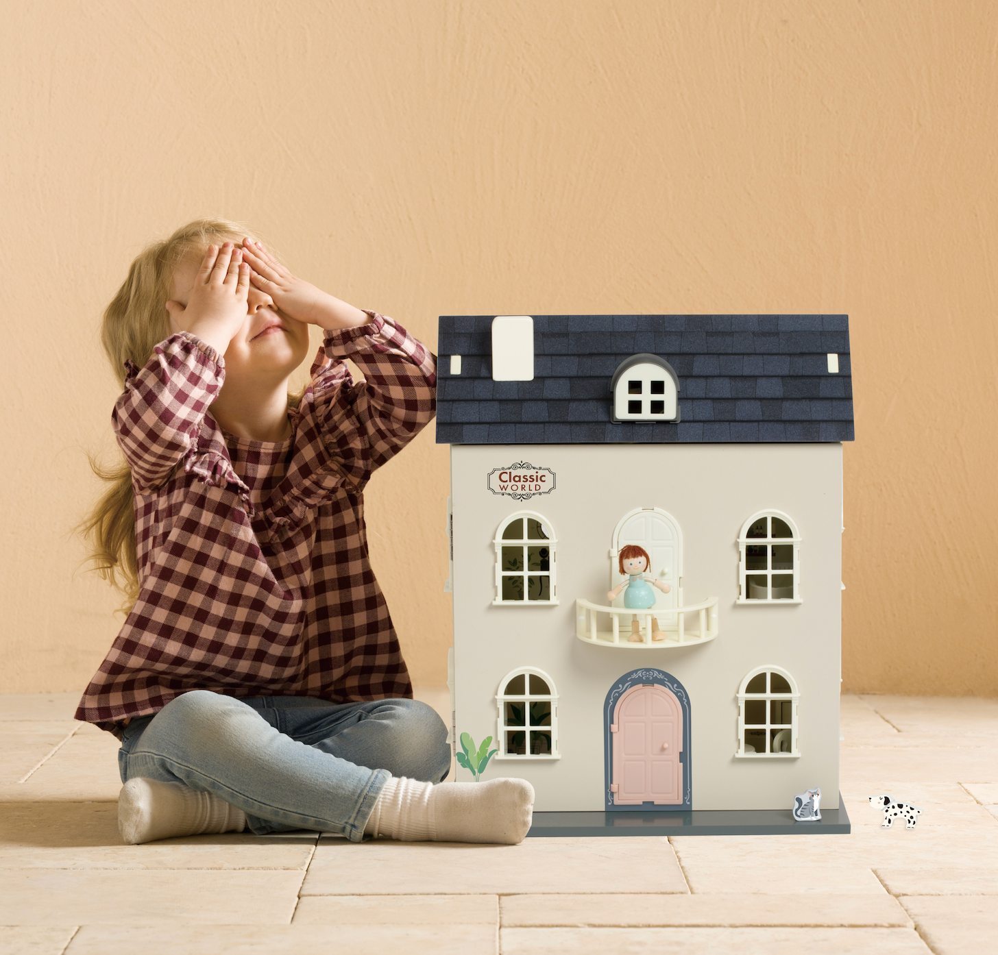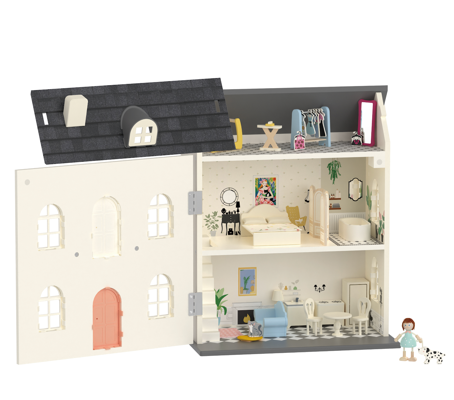 ¡Qué casa de muñecas de estilo vintage! Una fantástica casa de muñecas de 3 pisos, bellamente decorada y equipada con muebles variados. Abre las puertas de la casa para jugar y ciérralas para guardar todo adentro y transportarla más fácilmente. ¡Los niños pueden crear su propio mundo e inventar sus propias historias! La casa se puede abrir a través del techo para un mejor acceso a las diferentes habitaciones. Los muebles incluyen accesorios para decorar: una cama con cobijas, bañera, sofá, lámpara, mesa, 2 sillas, cocina, refrigerador, etc.