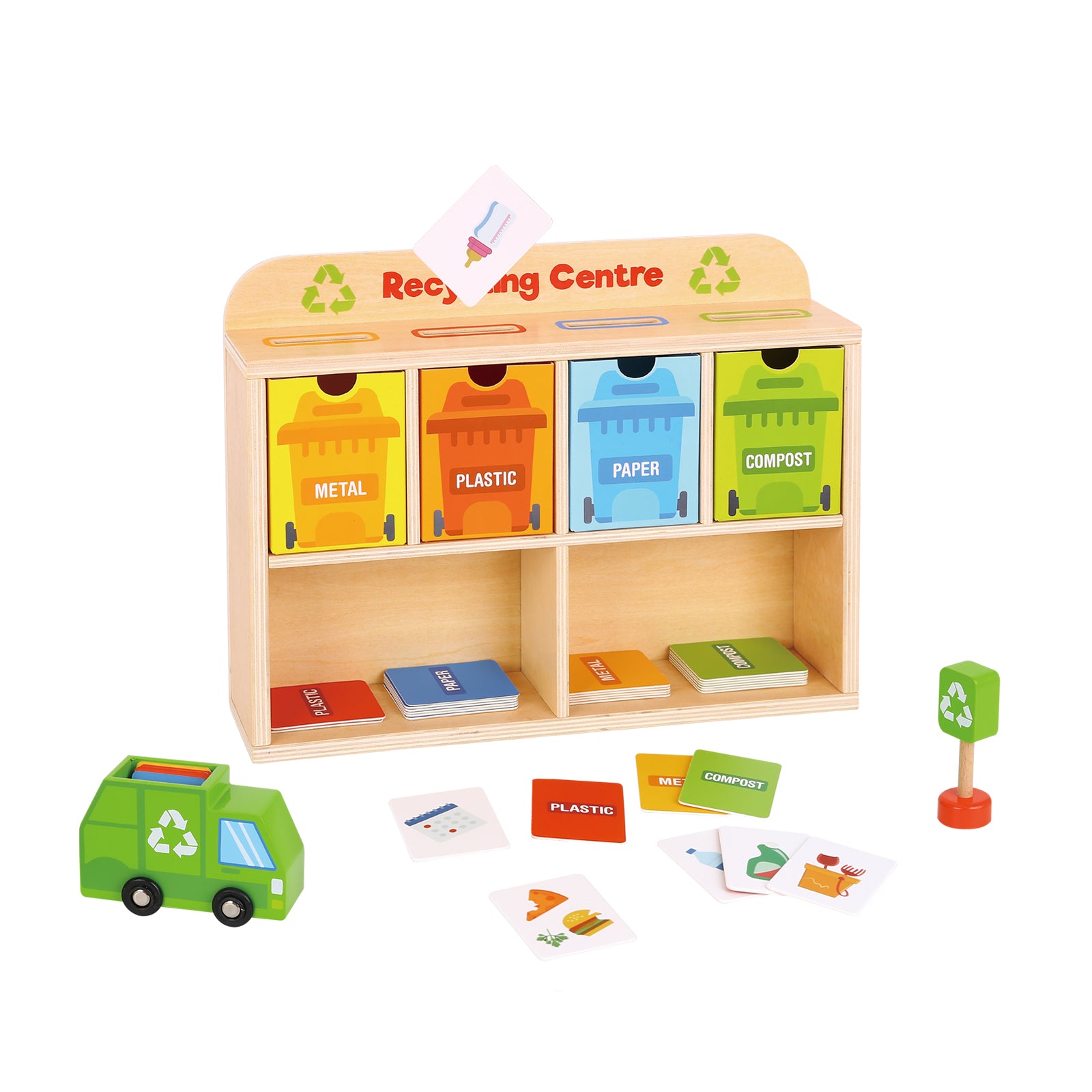 El centro de reciclaje incluye un camión de reciclaje y señalización. El centro en sí tiene 4 secciones de reciclaje y conjuntos de tarjetas; ¡coloca las tarjetas en la ranura a la que pertenecen! ¿Son de metal? ¿Plástico? ¿Papel? ¿O compost?