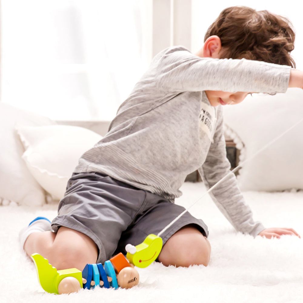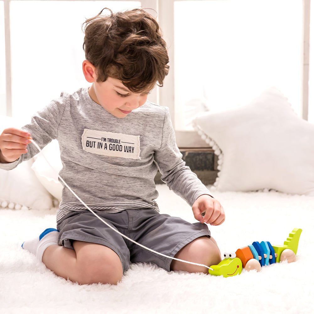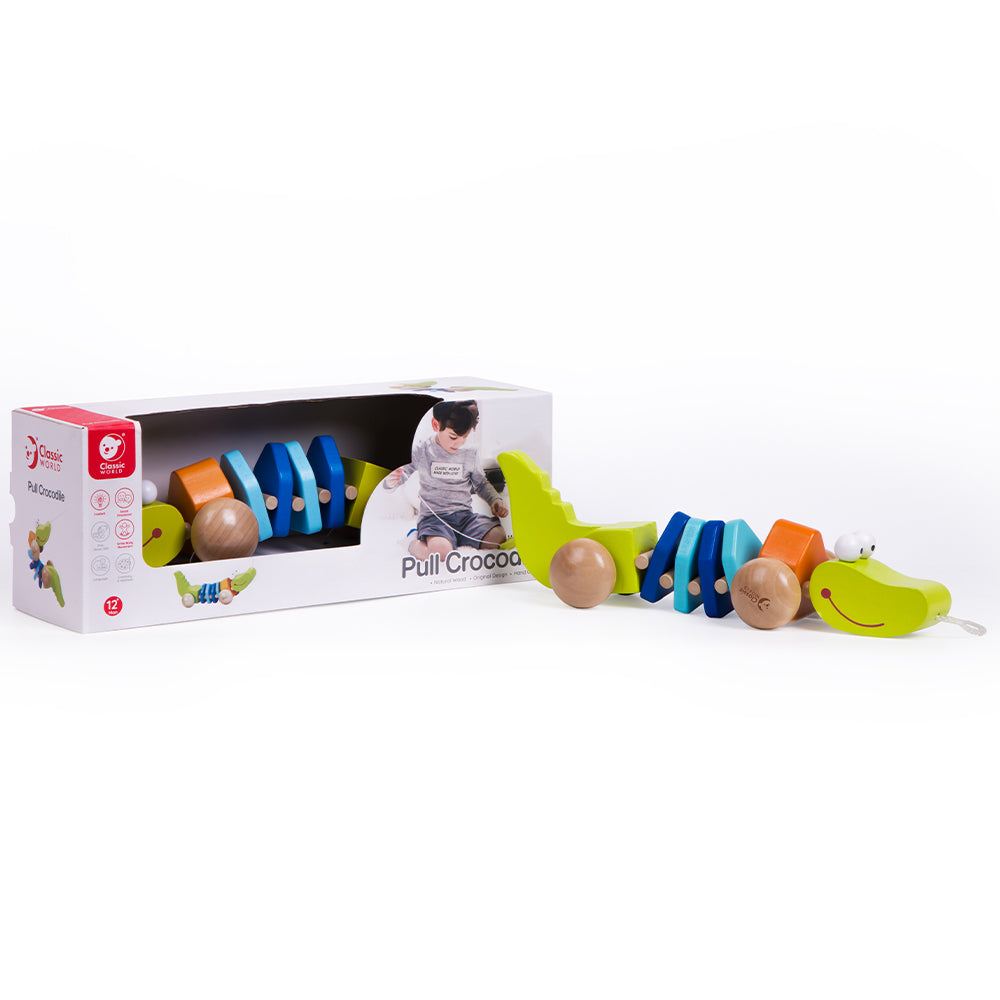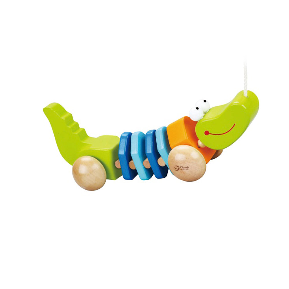 El Cocodrilo de arrastre es lindo, colorido y se mueve mientras camina. Fomenta el juego imaginario y estimula las habilidades tempranas de caminar.