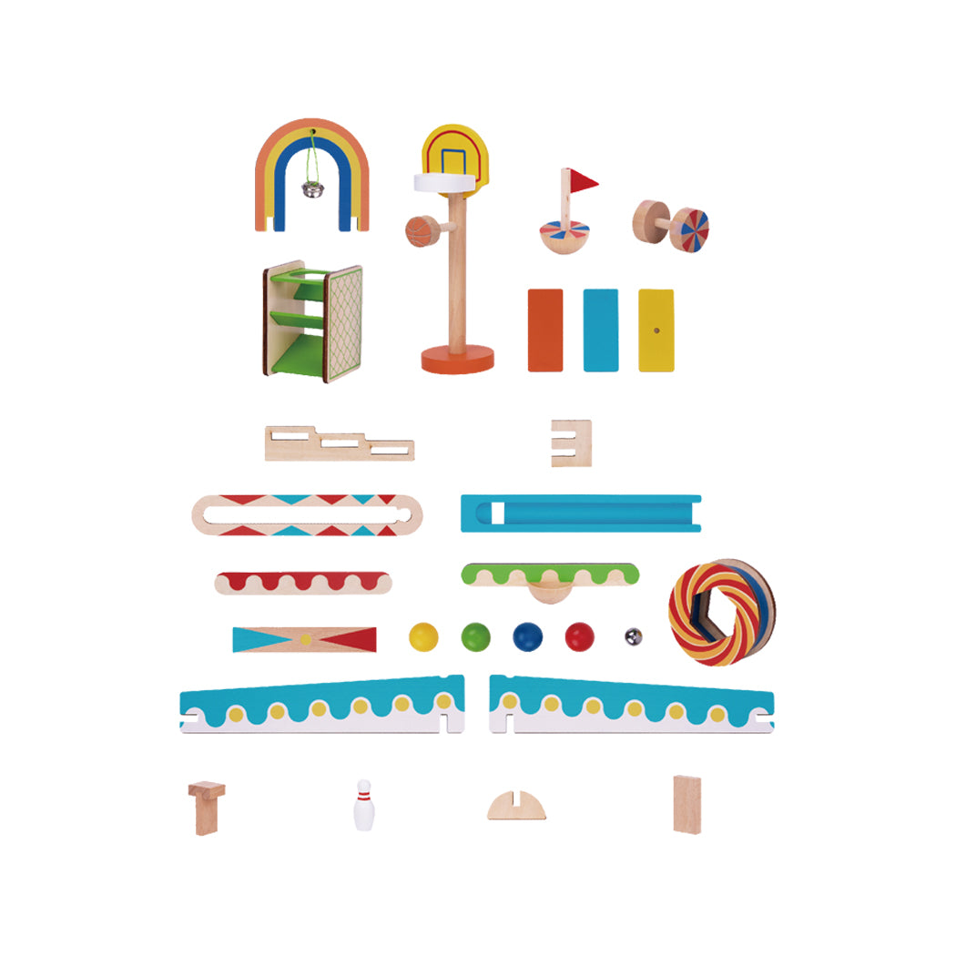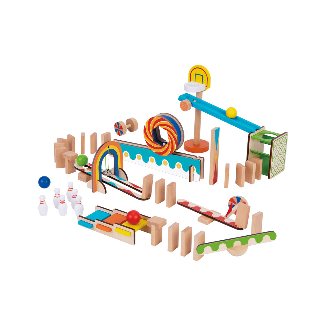 Lo que distingue a este kit son los elementos adicionales como escalones, torres de campanas y más, añadiendo una capa extra de emoción a tu carrera de dominó. Crea tu propia pista única con rampas, rodillos, escalones y balancines, y contempla la maravilla en acción.
