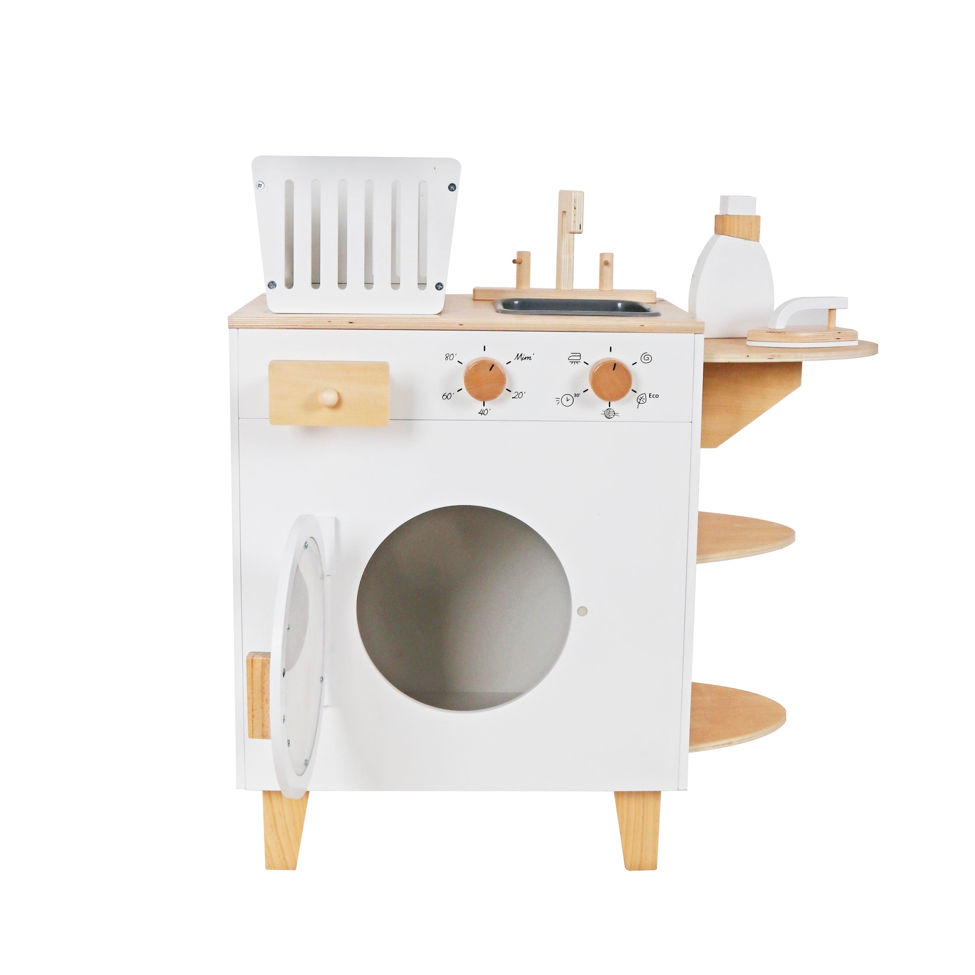 Este juguete de madera permite a los niños de 3 años en adelante disfrutar de un juego de simulación realista, imitando la rutina de lavar la ropa mientras desarrollan habilidades motoras y coordinación.