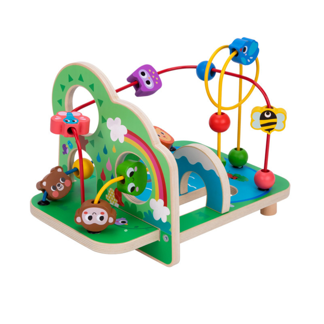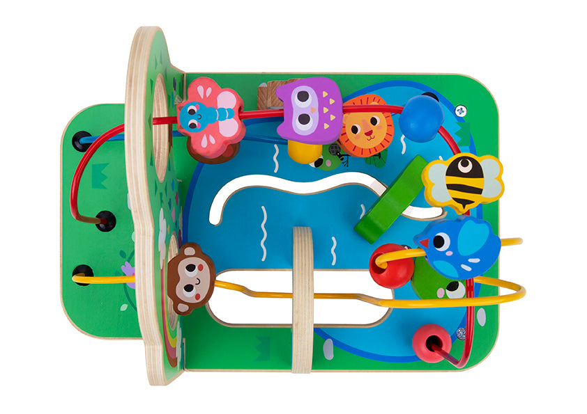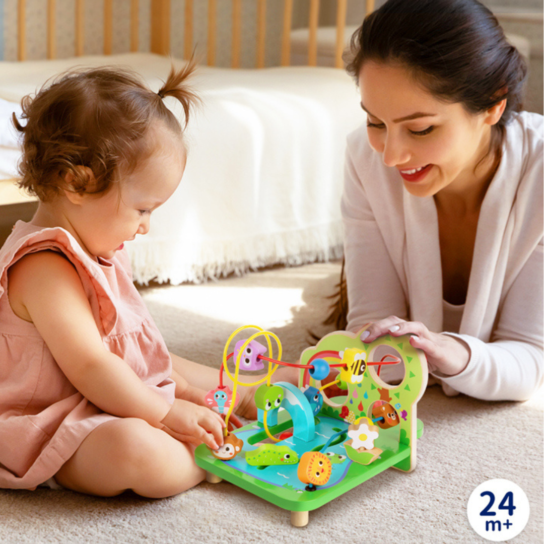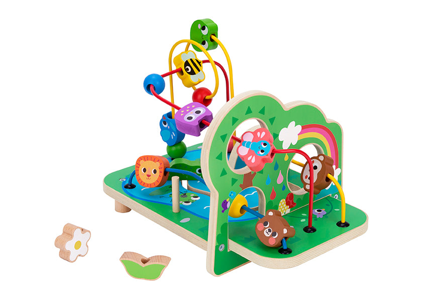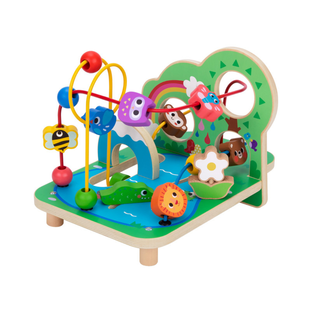 Con el laberinto de madera, el niño practica sus habilidades motoras finas a través del movimiento en espiral, mientras al mismo tiempo aprende las formas y los animales del bosque.