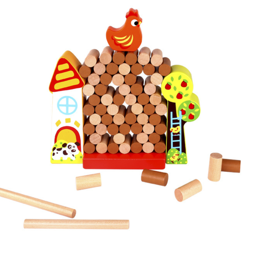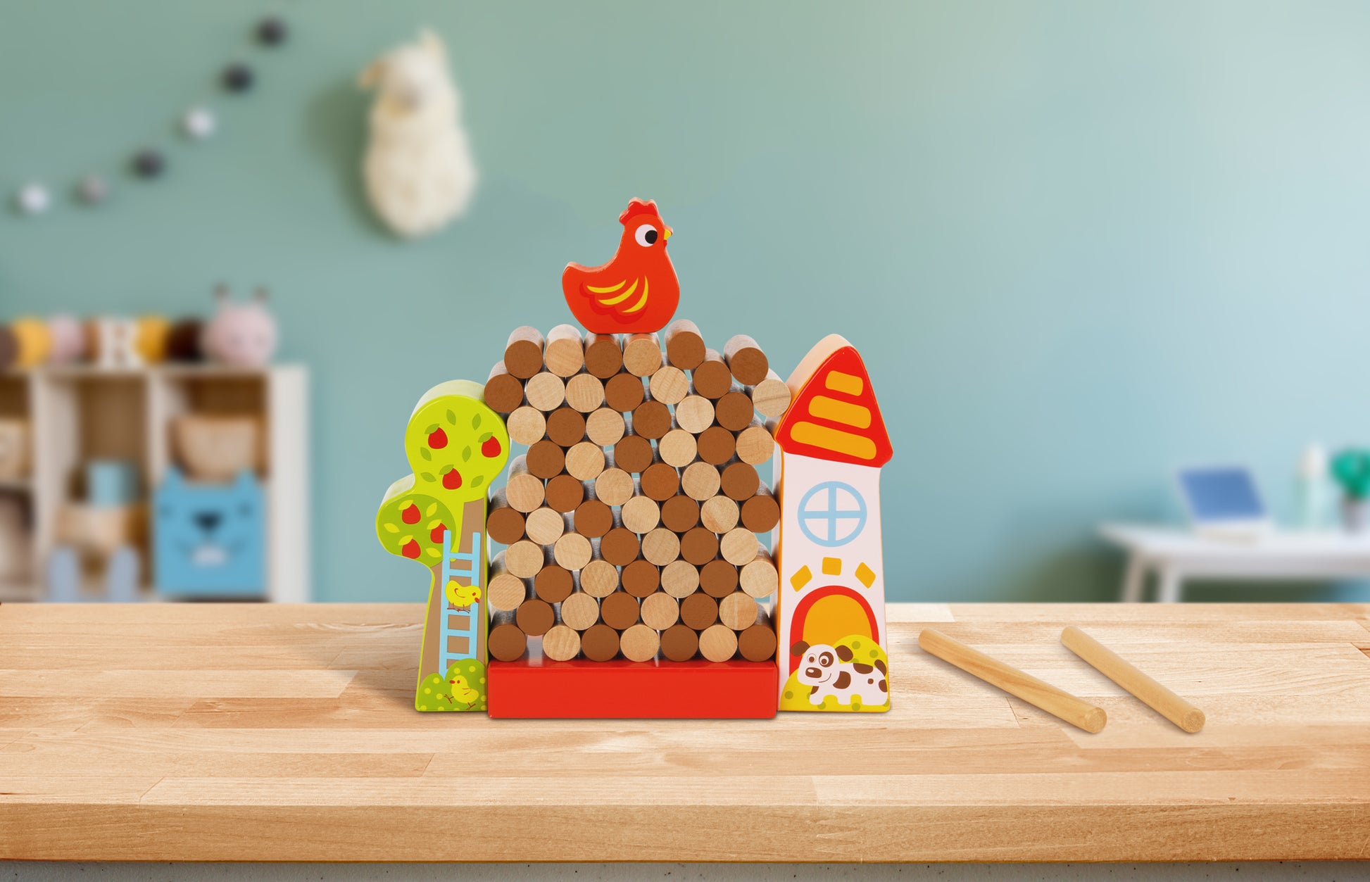 Los jugadores toman turnos para retirar las piezas (varillas) del conjunto sin dejar caer los pollitos que están en la parte superior de la torre. Pueden usar varillas largas para empujar las piezas fuera de la pila, pero deben hacerlo con cuidado para evitar que los pollitos se caigan.