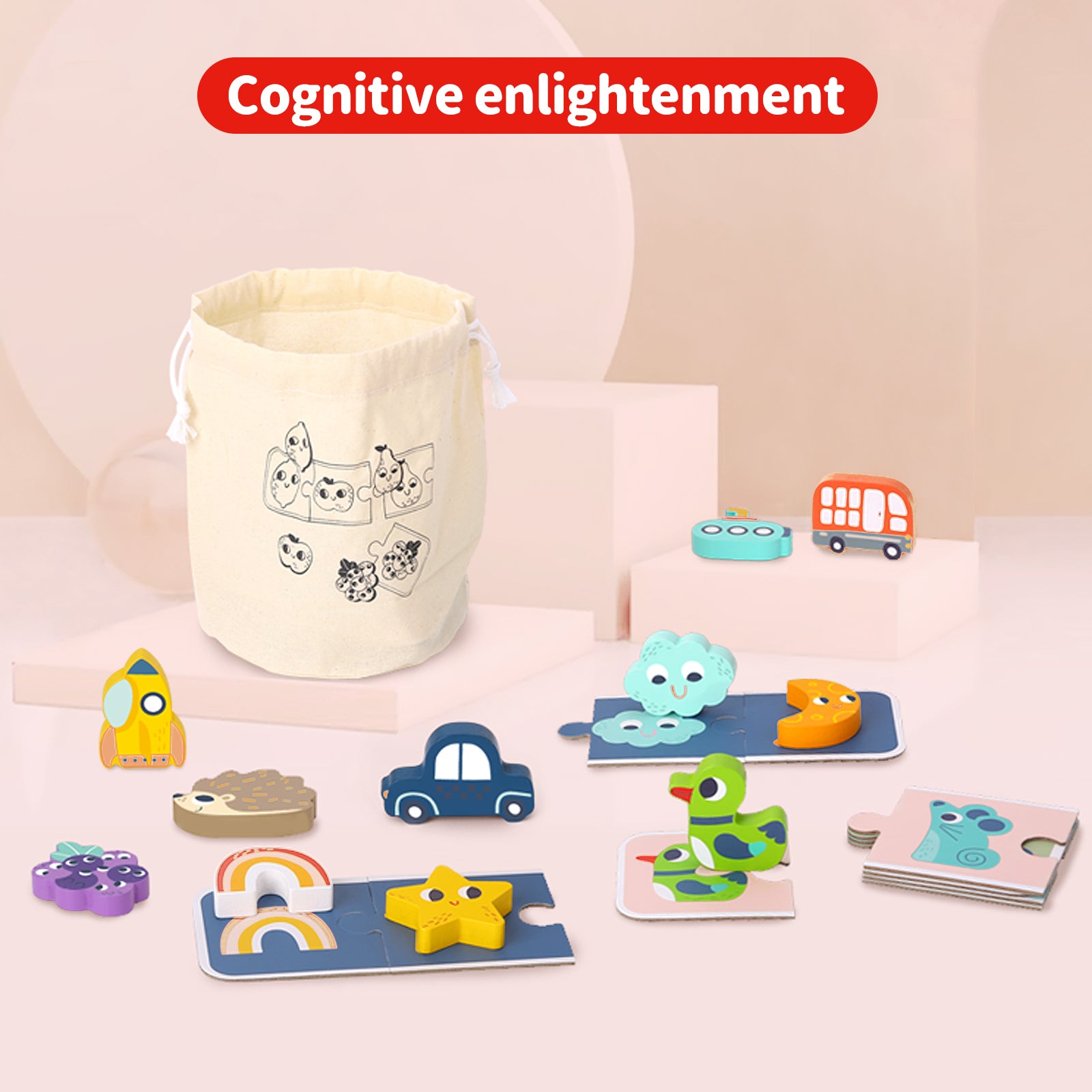 Este juego de memoria es para 2 a 4 jugadores e incluye 16 piezas de madera y 16 piezas de rompecabezas para crear 4 tarjetas de juego y una bolsa de tela.