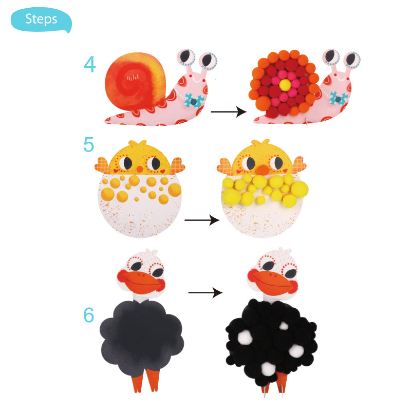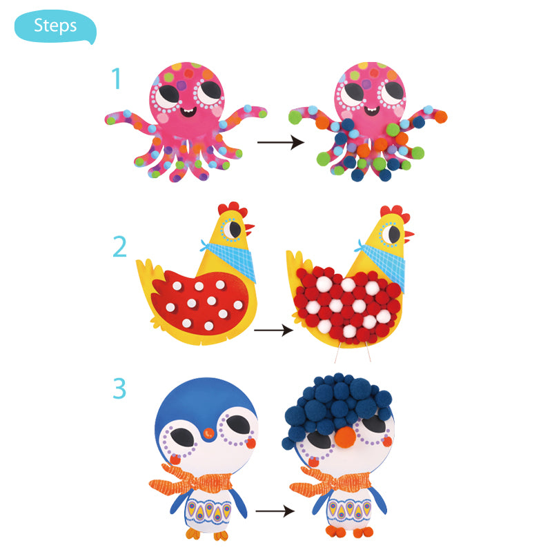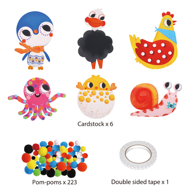 Decora y crea tus propios animales coloridos y únicos con el kit de manualidades de personajes con pompones de Tookyland. En este kit recibirás más de 200 pompones de fieltro para pegar y decorar 6 diseños de animales de cartón diferentes. Elige entre todos o uno de los siguientes animales para decorar: pingüino, avestruz, gallina, pulpo, pollito o caracol, y sé creativo con los colores de los pompones y el pegamento. Se necesita supervisión de un adulto para pegar.
