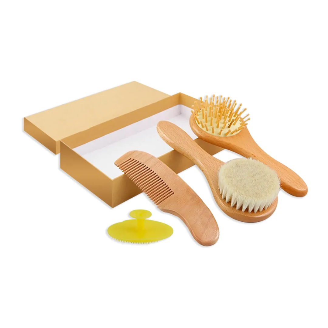 Este juego incluye un cepillo de pelo suave, un cepillo de masaje de madera, un peine de madera y un cepillo de silicona para limpiar el pelo del bebé.