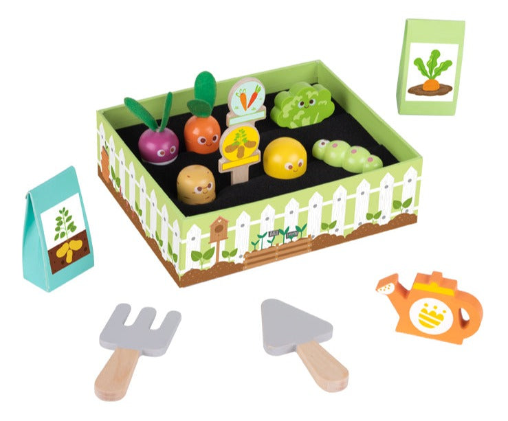 Un magnífico conjunto de juego con el que podrás introducir a tu hijo en la profesión de la jardinería e inculcarle un amor por la tierra. El conjunto consta de un total de 14 piezas, que incluyen diversas figuritas de vegetales para plantar, pala, paleta, soportes, así como un lugar donde se pueden plantar los vegetales.