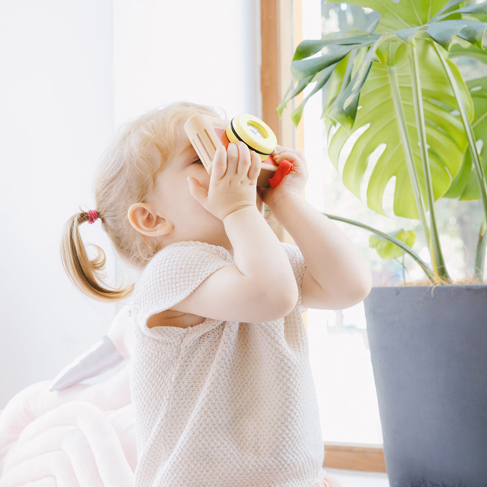 ¡Sonríe y haz clic! ¡A tu bebé le encantará fingir que toma fotos como si fuera una cámara real! Con un cuerpo vintage, una lente de caleidoscopio giratoria y un botón de obturador, esta cámara de madera de Classic World ganará el afecto de tu bebé.