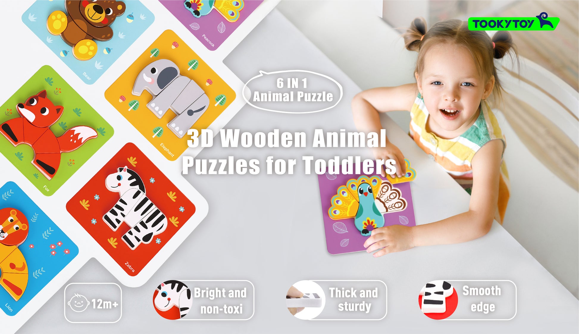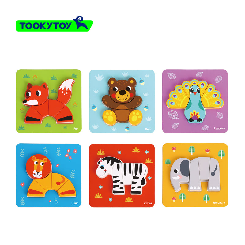 Set de 6 puzzles de madera para niños de 1 a 4 años, los juguetes de madera incluyen rompecabezas de oso, zorro, pavo real, elefante, cebra y león.