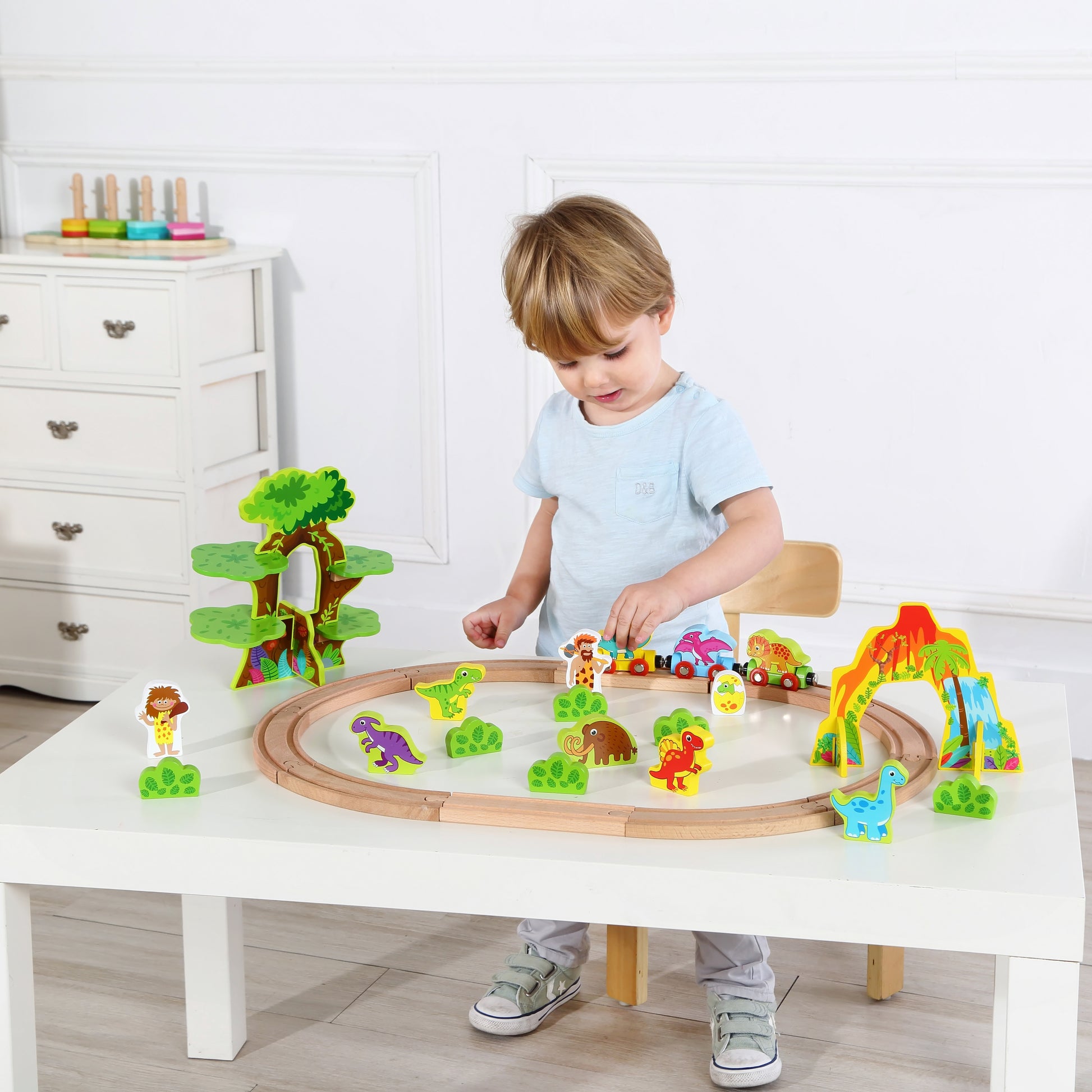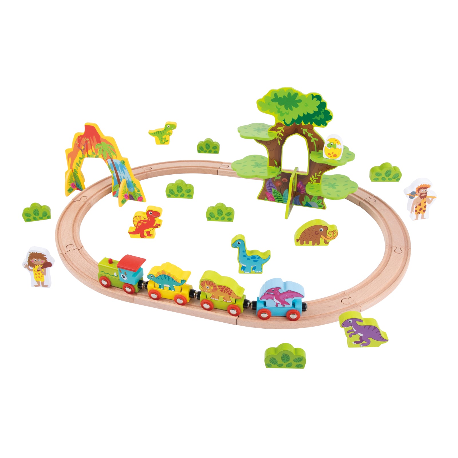 Construye y da forma a tu propia vía de tren de madera con esta pista de dinosaurios. Viene con un tren, dinosaurios y una casa en el árbol. ¡Crea tu propio ferrocarril de dinosaurios!