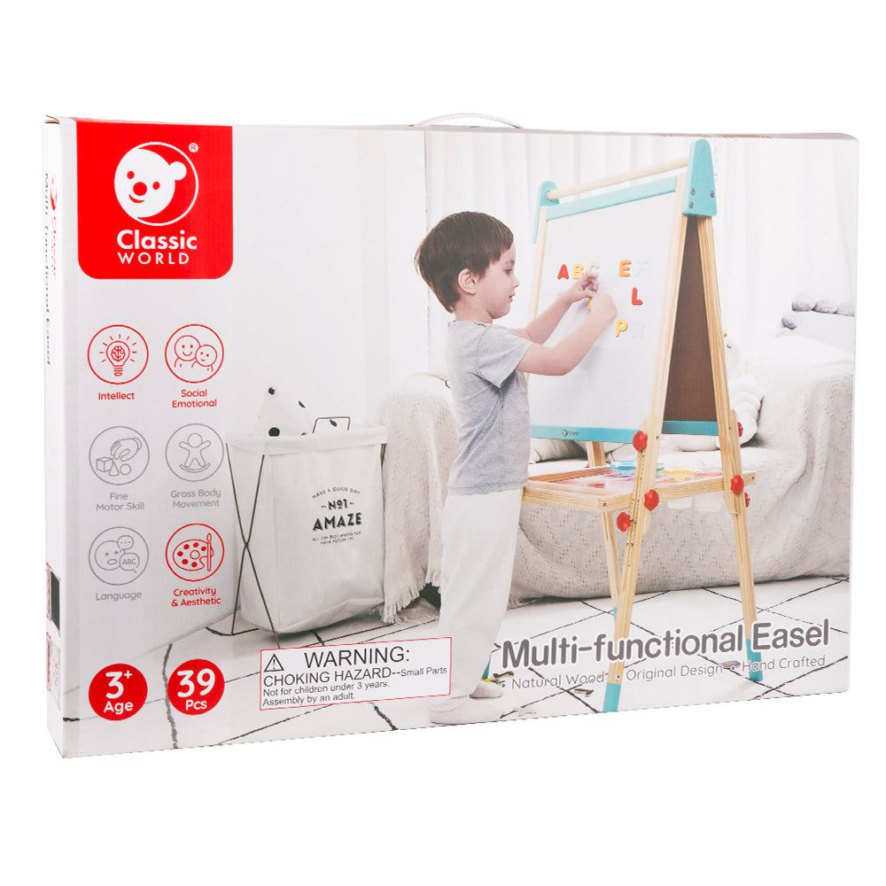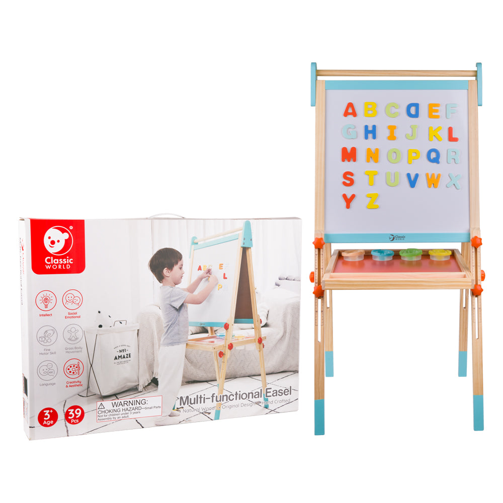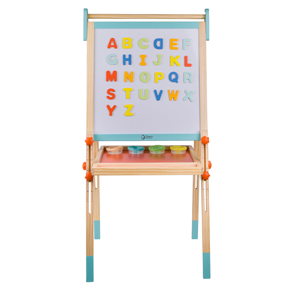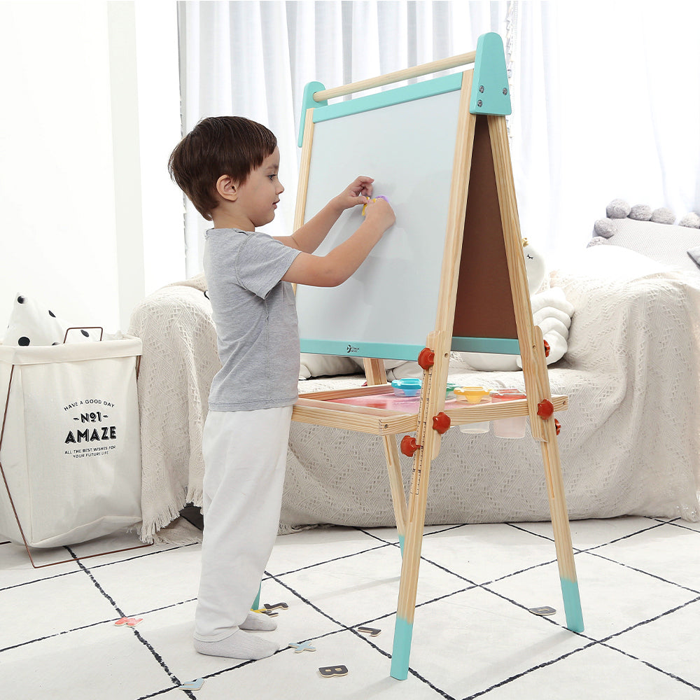 El caballete plegable tiene una pizarra y una pizarra blanca magnética para que los niños puedan hacer bonitos dibujos. La escala en los marcos laterales permite un fácil ajuste de altura. Incluye tazas de pintura de plástico y alfabetos magnéticos en inglés. Les ayuda a aprender inglés y a desarrollar su creatividad.