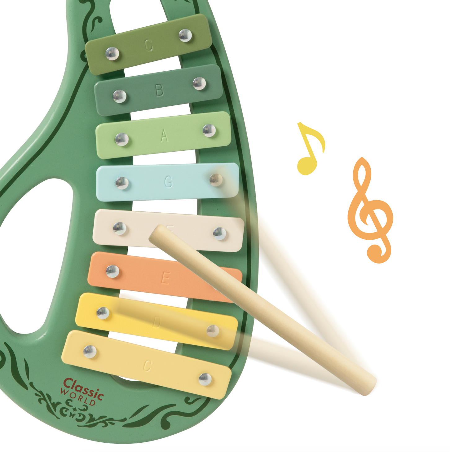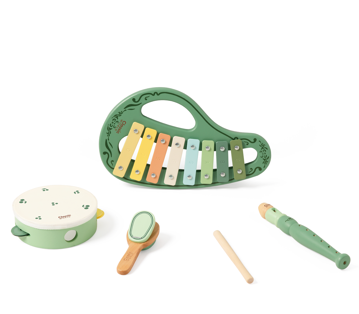 Juego de instrumentos musicales para recrear los sonidos del salón musical clásico. Incluyen glockenspiel, sonaja, flauta y tambores.