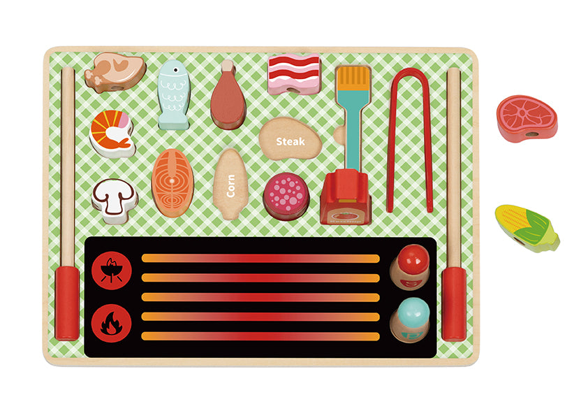 Este increíble set de barbacoa de madera permite a los niños preparar sus propias parrilladas con brochetas, carnes, verduras y condimentos llenos de color.