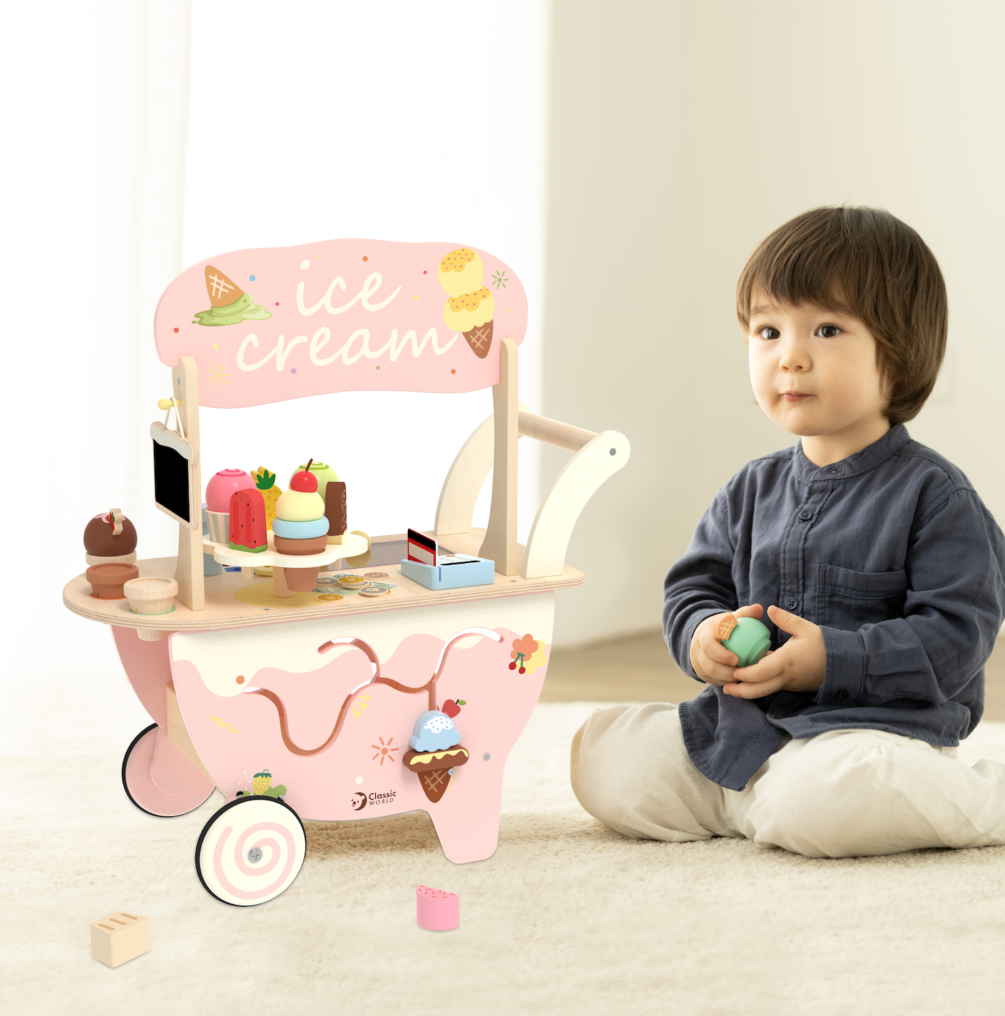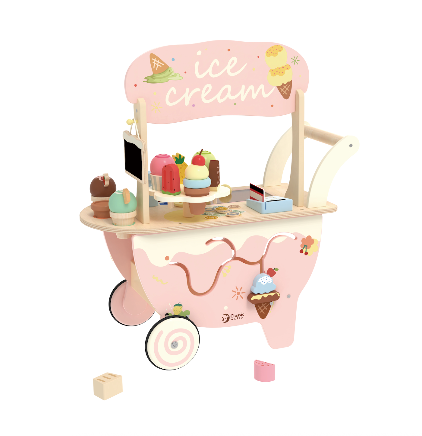 ¿Quién quiere un helado? Este adorable andador presenta un carrito de helados con muchos sabores diferentes. Los niños pueden empujarlo mientras realizan divertidas interacciones.