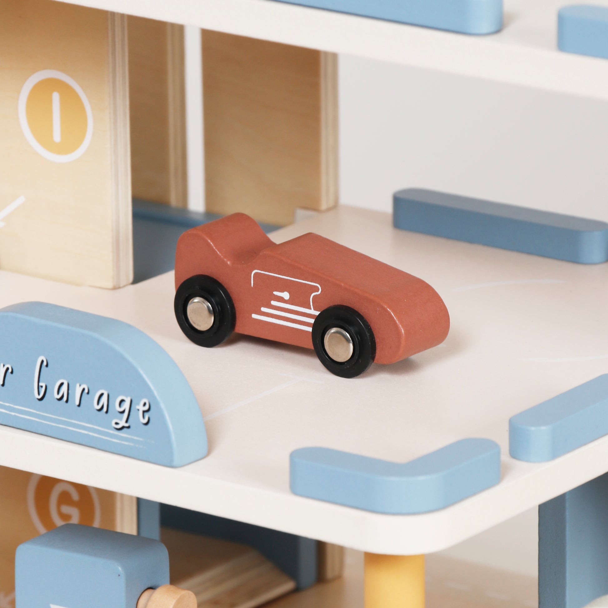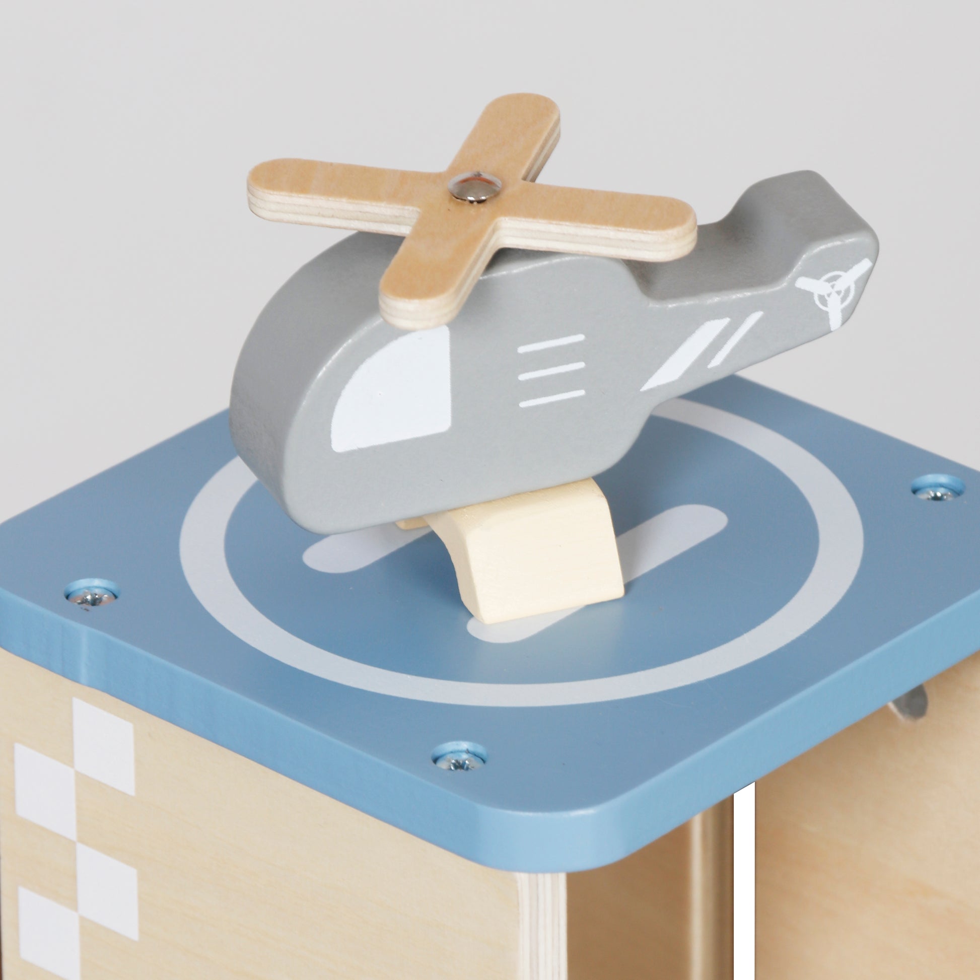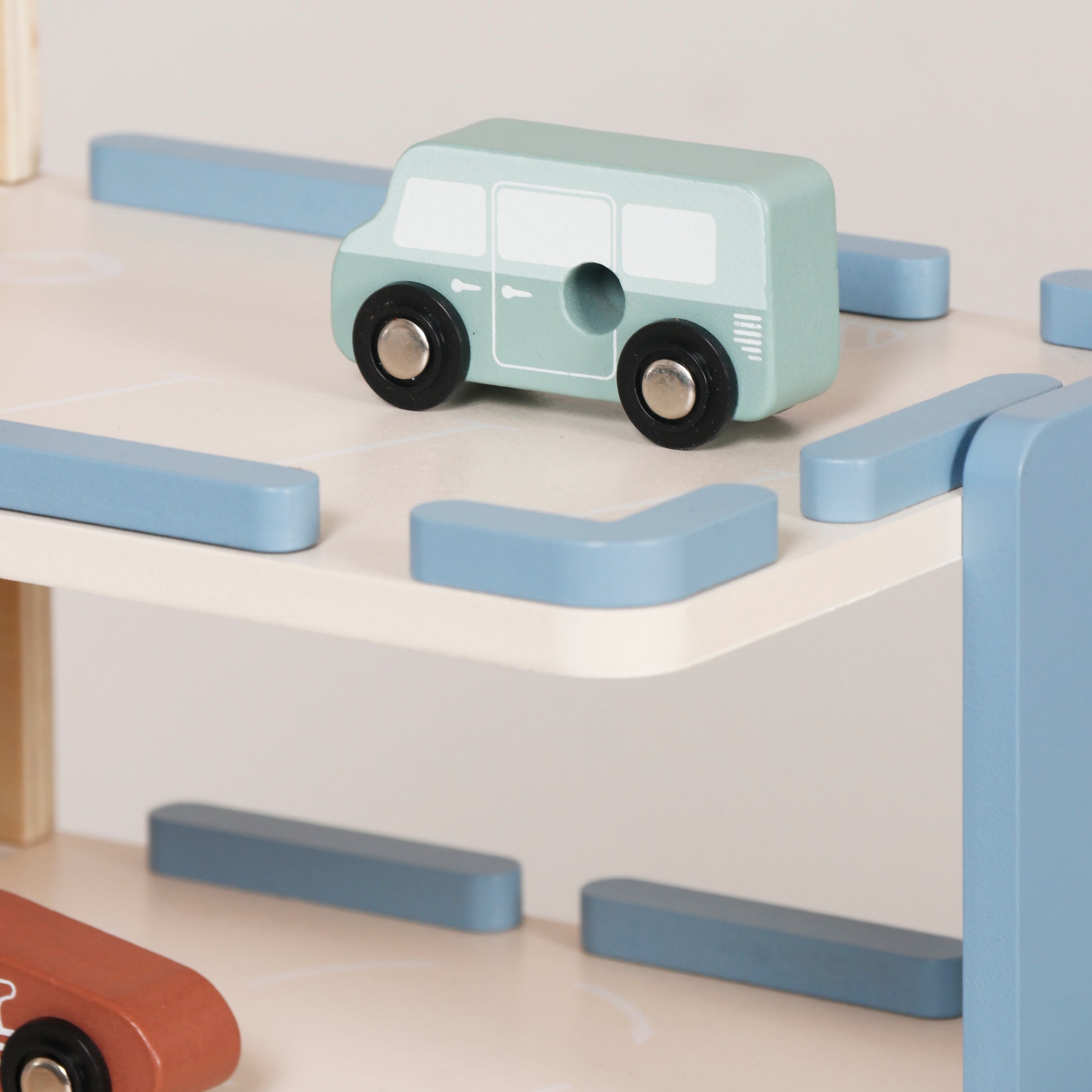 Esta moderna torre de estacionamiento de madera es perfecta para pequeños amantes de los autos. Con 3 niveles de juego, incluye rampas, ascensor funcional, estación de carga, semáforo, helipuerto y varios vehículos de madera.