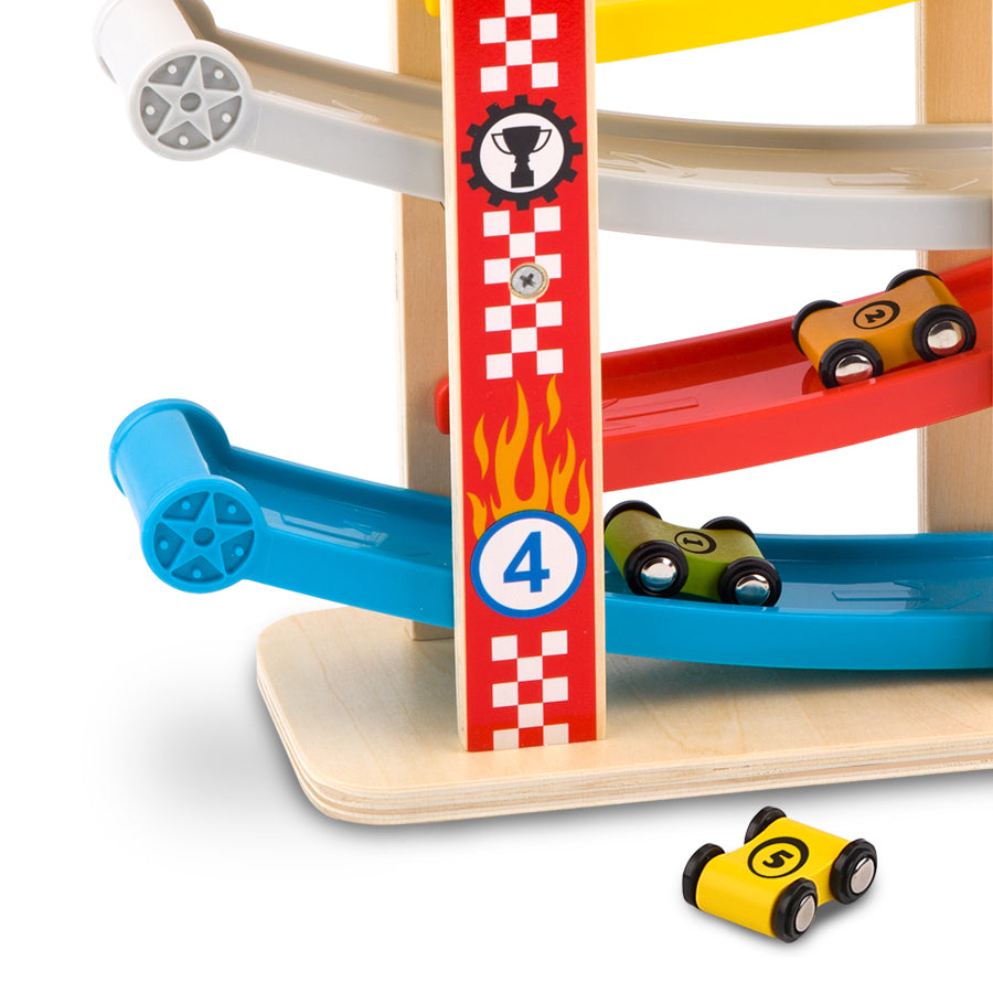Esta colorida torre de rampas esta diseñada para que los carritos se deslicen de una manera emocionante.