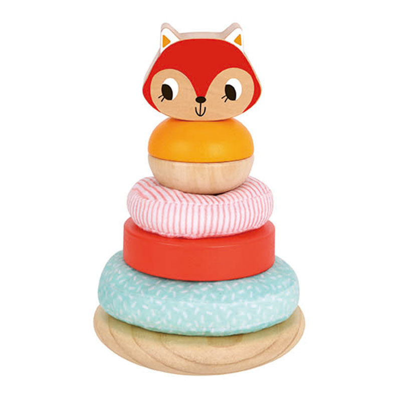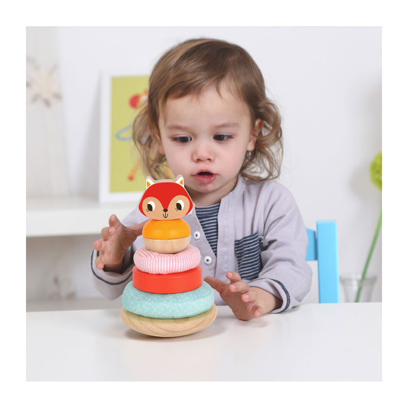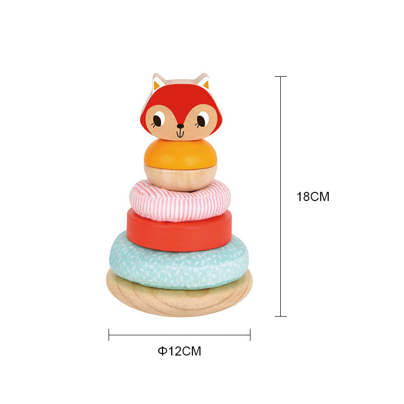 Dos anillos de apilamiento están hechos de madera, y los otros dos son de tela; tienen diferentes colores y tamaños, lo que ofrece estimulación visual y ayuda al niño a descubrir tamaños, materiales y combinaciones de colores.